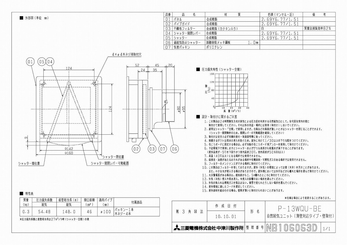 【11/4 20:00〜11/10 23:59 マラソン期間中、エントリーでポイント最大37倍】 P-07WQU-BE 三菱電機 給気ユニットシステム部材 自然給気ユニット(壁取付・カテキンフィルター付) P-07WQU-BE